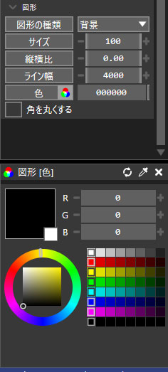 白色ではなく別な色が良い!という時はカラーコード(例:#ffffff)を直接入力するか「図形」にある「色」を選択すると、色のウィンドウが表示されるのでそこから色を変更します。(便利なので色のウィンドウはそのまま表示しててOKです)