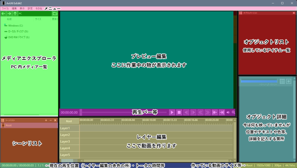 基本的によく使うのは下中央のレイヤー編集と右下のオブジェクト詳細、中央の再生バーです。