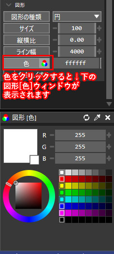 白色ではなく別な色が良い!という時はカラーコード(例:#ffffff)を直接入力するか「図形」にある「色」を選択すると、色のウィンドウが表示されるのでそこから色を変更します。(便利なので色のウィンドウはそのまま表示しててOKです)