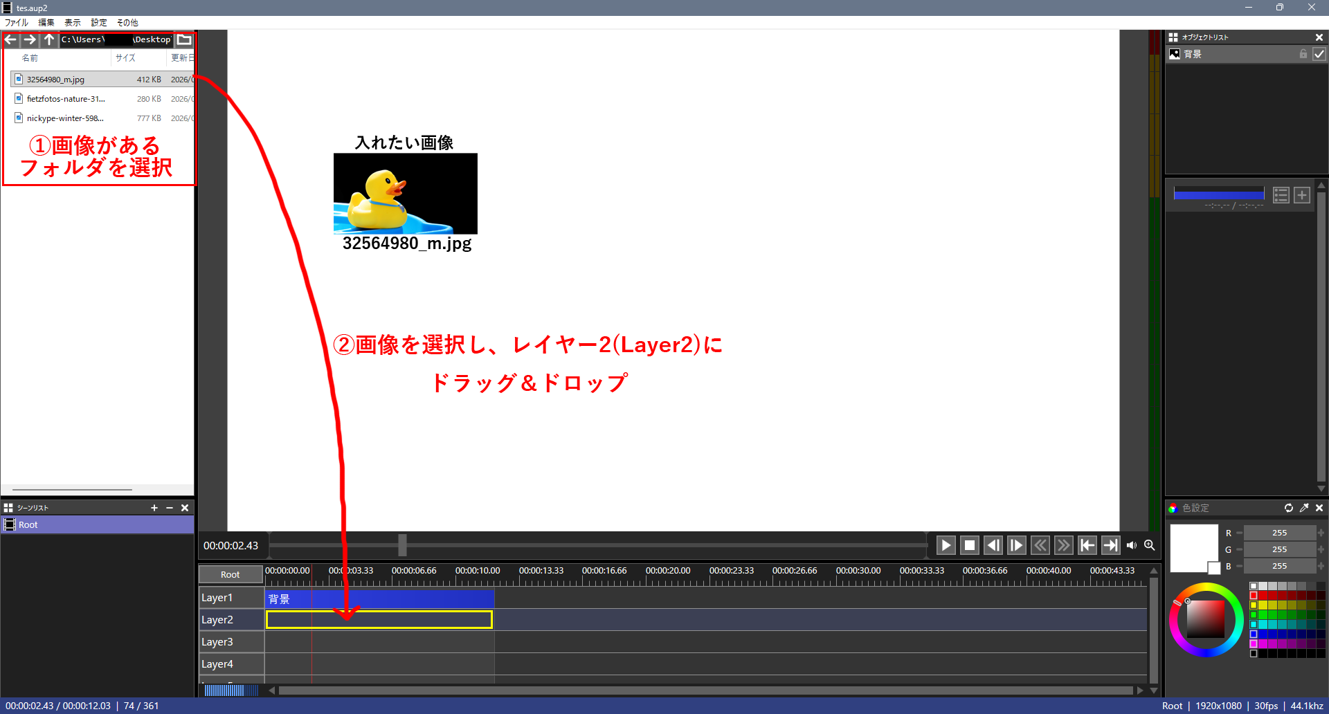レイヤー2(Layer2)に写真を入れます。