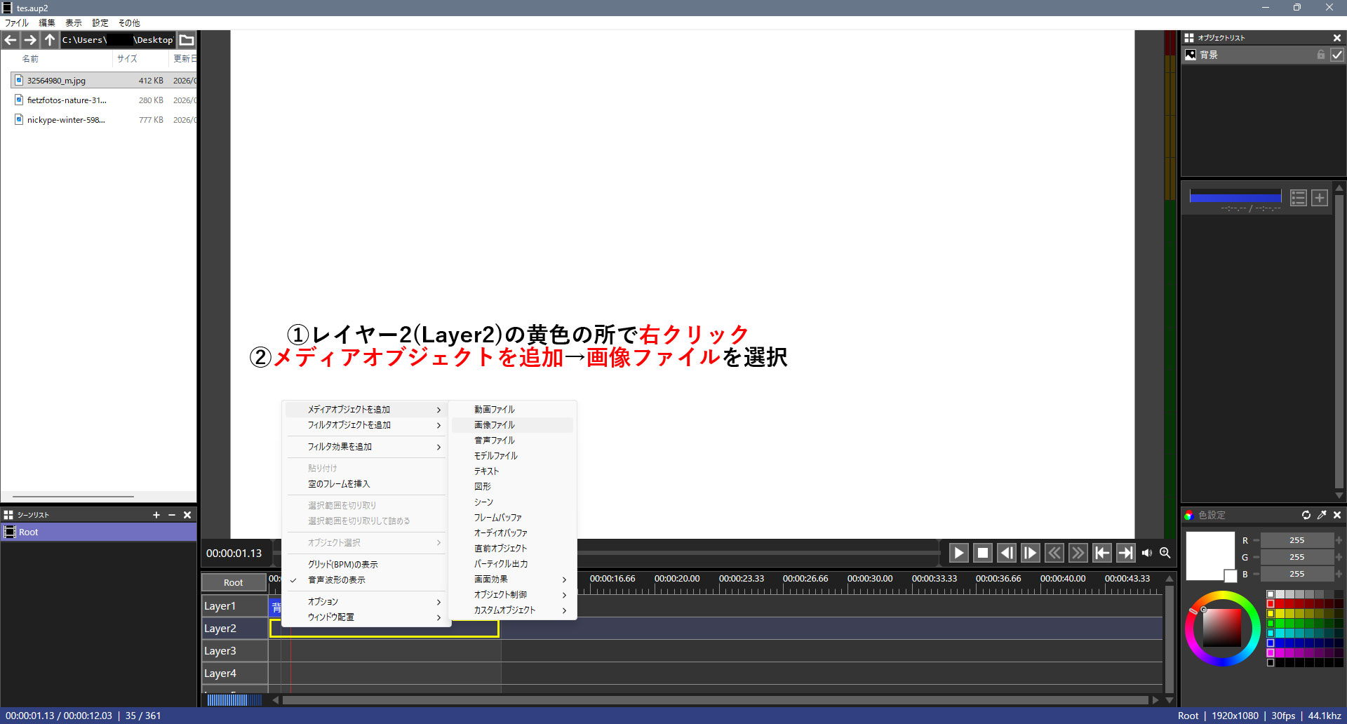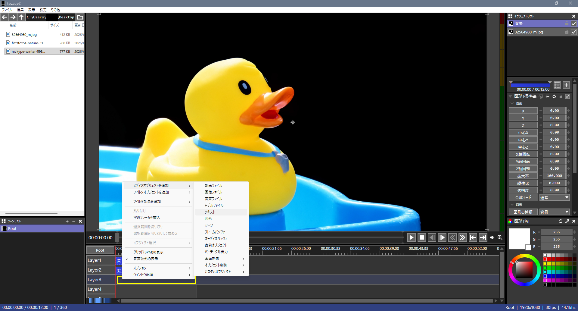 レイヤー3の黄色内で右クリックメディアオブジェクトを追加テキストを選択します。