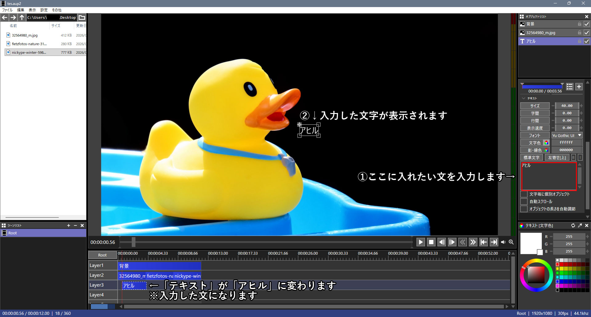 そうするとプレビュー画面に「アヒル」と文字が表示されます。同時にレイヤー3にあるオブジェクトが「テキスト」から「アヒル」に変わります。