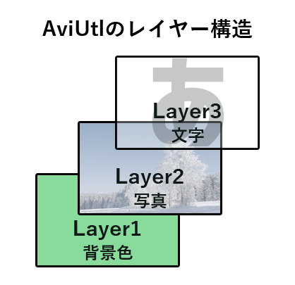 AviUtlはレイヤー1(Layer1)が一番下(奥)になり、その上にレイヤー2.3.4…と重なって表示していく構造になっています。アニメのセル画や、手作りの写真アルバムをイメージしていただけるとわかりやすいかと思います。