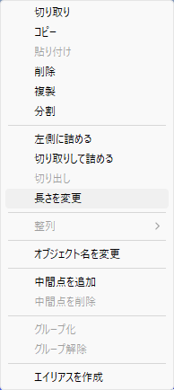 表示する時間が12.02秒等ではなく12秒という綺麗な数字にしたい!という時は変更したいオブジェクトの上で右クリック長さを変更→表示したい秒数を入力しOKをクリックで綺麗な長さのオブジェクトができます。
